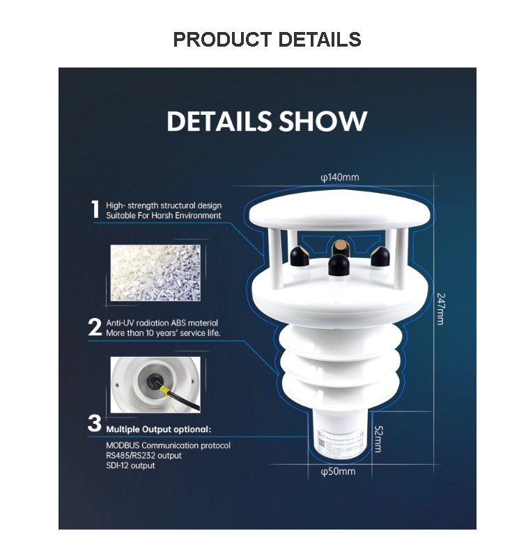 This automatic weather instrument is simultaneously measure the atmospheric temperature, atmospheric humidity,air pressure,wind speed, wind direction, solar radiation,Illuminance/UV, dust concentration and precipitation. Temperature, humidity and air pressure sensor is placed within the radiation shield. Wind speed and direction of ultrasonic rinciple. 24G radar detection on rainfall, which can quickly detect rainfall and rainfall intensity. Internal GPS global positioning module and electronic compass can be mounted to the system to give a good indication of latitude and longitude and relative speed, which can calculate the real and virtual wind speed and direction, and is especially suitable for installation on motion vector, such as special vehicles or vessels, etc.