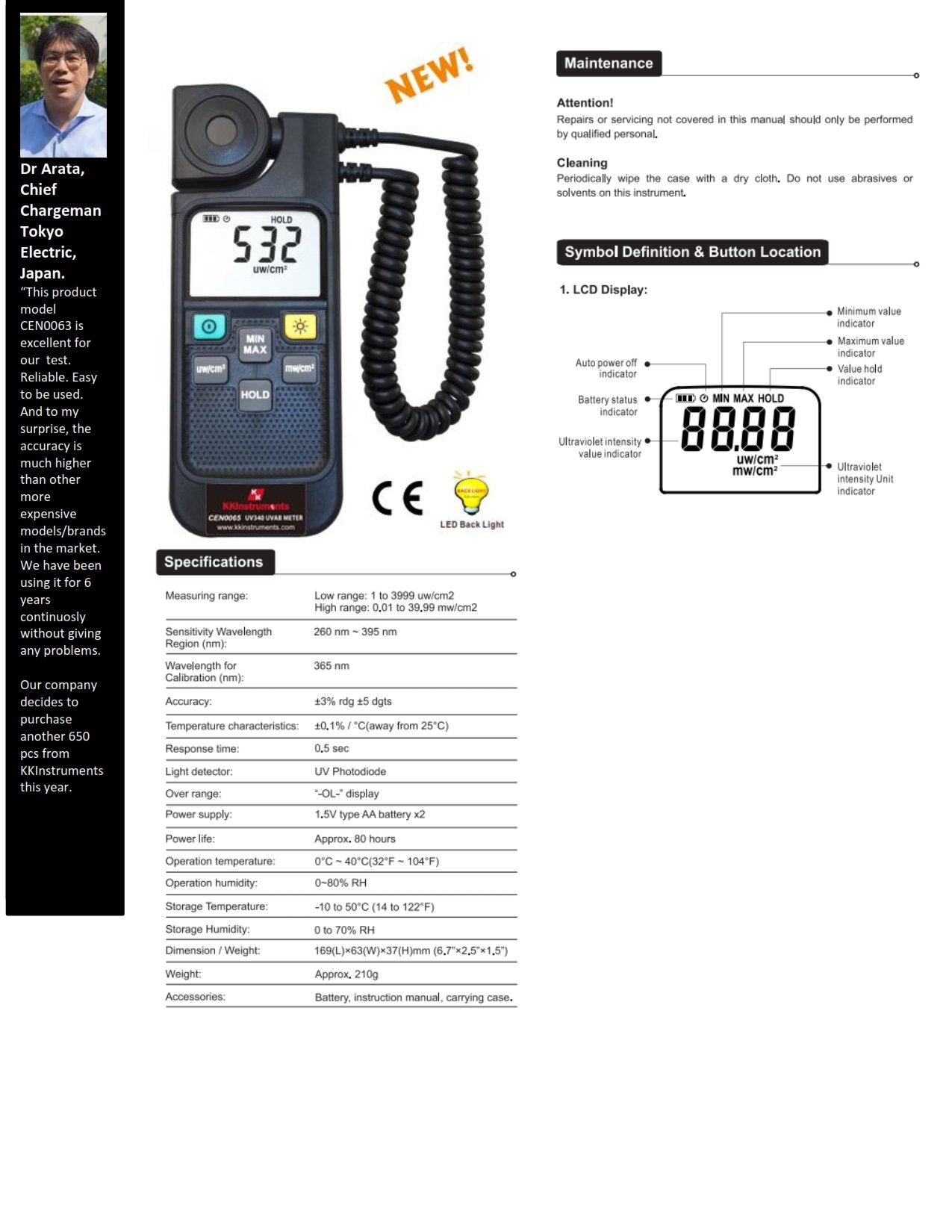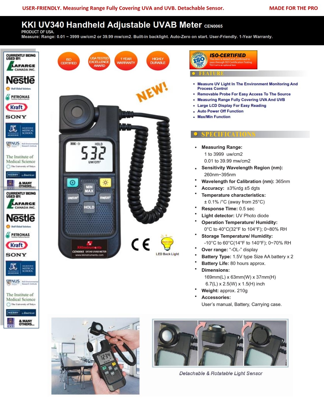 • Measure UV Light In The Environment Monitoring And Process Control • Removable Probe For Easy Access To The Source • Measuring Range Fully Covering UVA And UVB • Large LCD Display For Easy Reading • Auto Power Off Function • Max/Min Function