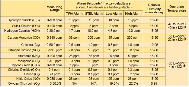 Available Gases: H2S, CO, O2, SO2, PH3, CI2, NH3, NO2, HCN, ETO, ClO2, O3, NO