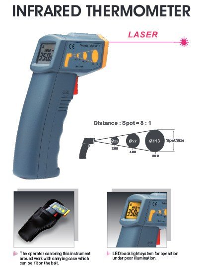 This is a reliable infrared thermometer. With the gun like shaping, users can aim laser indicator to the measuring target just by instinct. Celsius or Fahrenheit can be set through switch. Laser can also be turned off by user's preference.